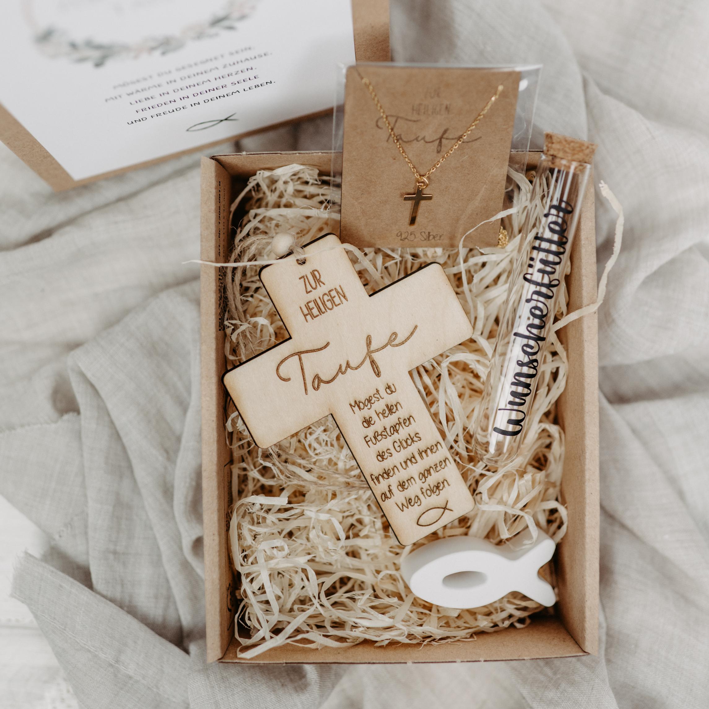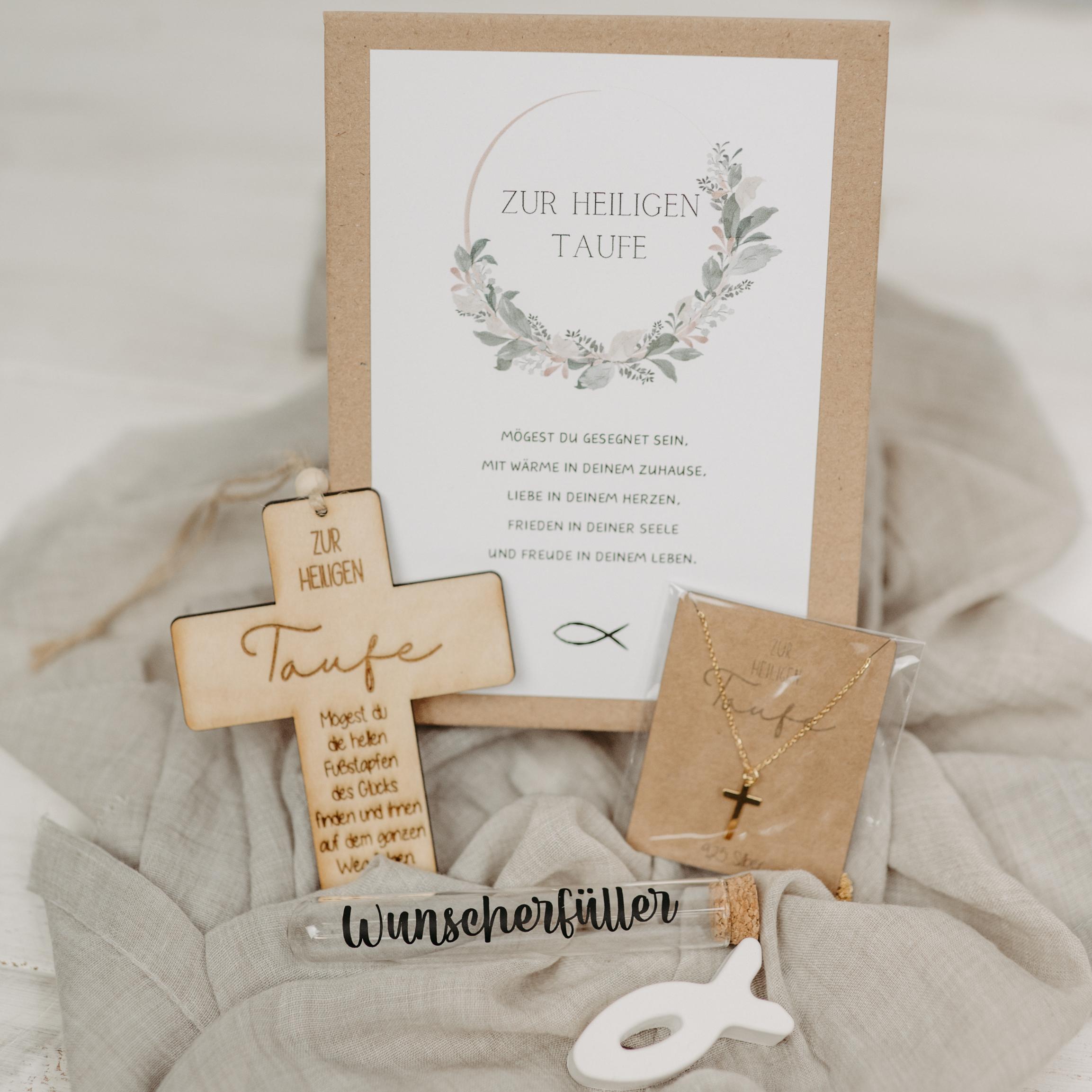 Geschenkbox zur Taufe – Geldgeschenk liebevoll verpackt, inkl. Kreuzkette, Holzkreuz & Wunscherfüller