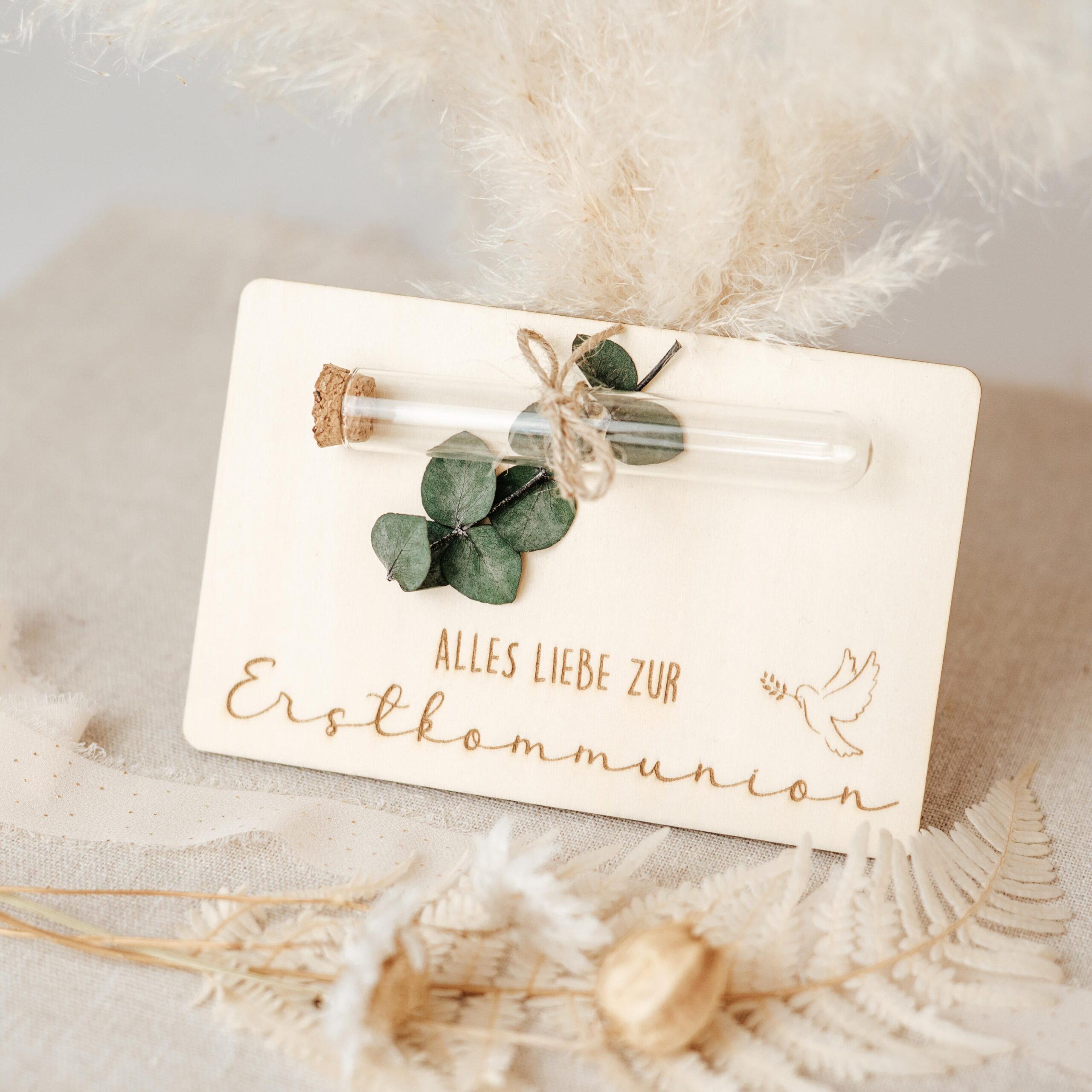 Diese liebevoll gestaltete Holzkarte zur Erstkommunion ist ein ganz besonderes Geschenk und Erinnerungsstück.