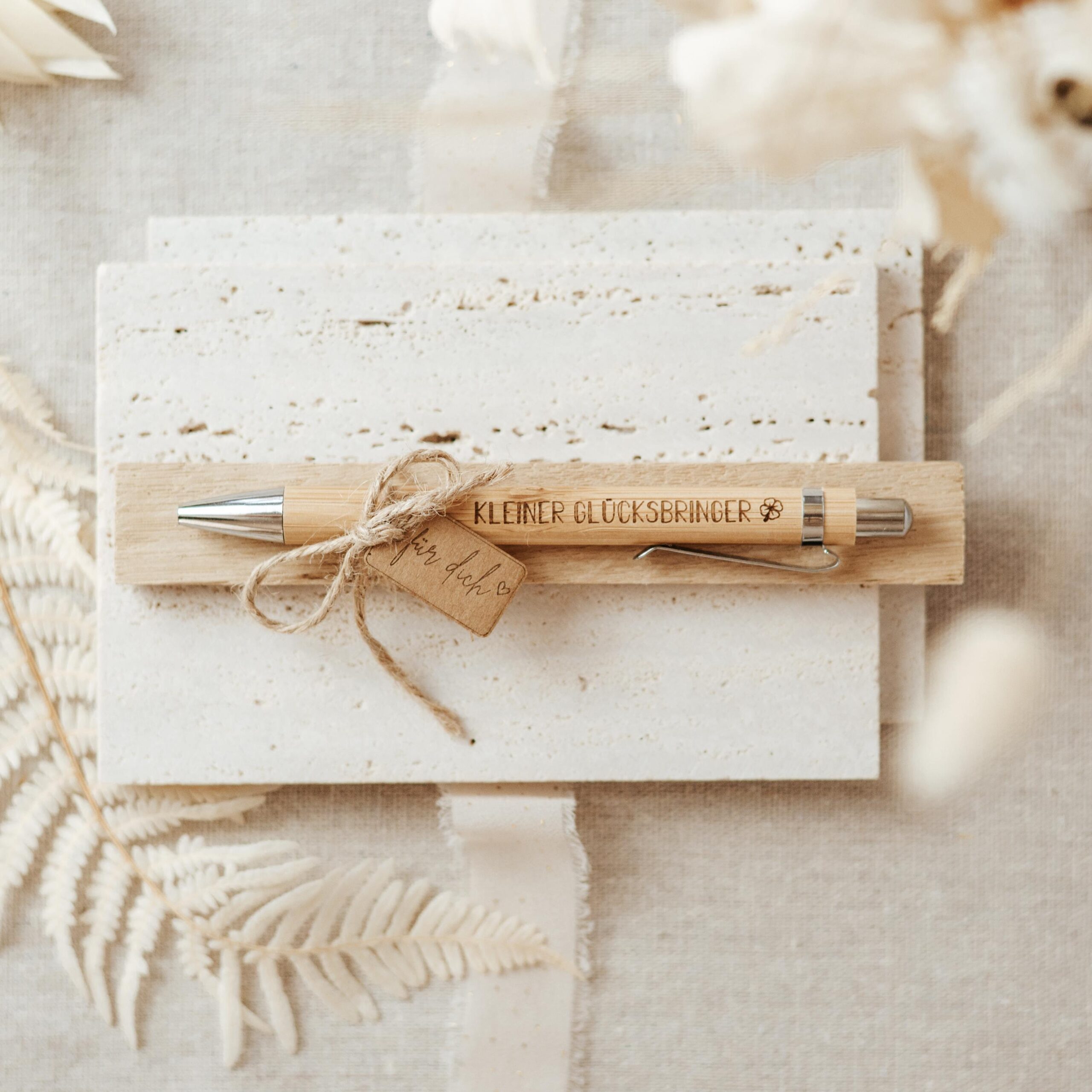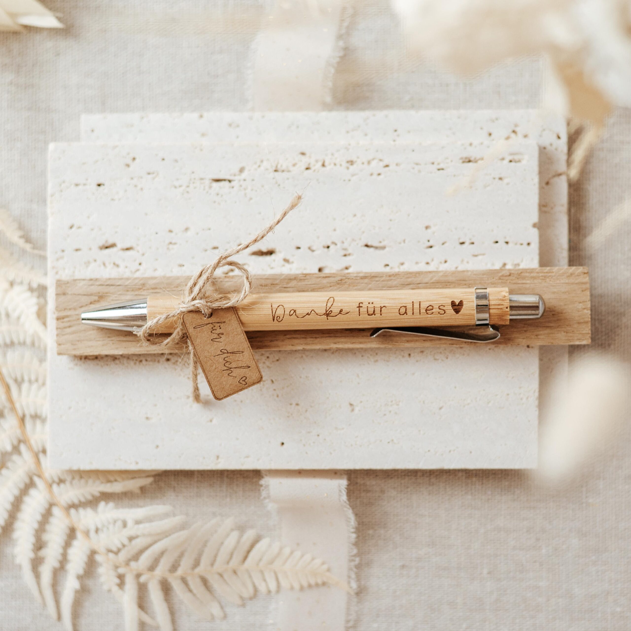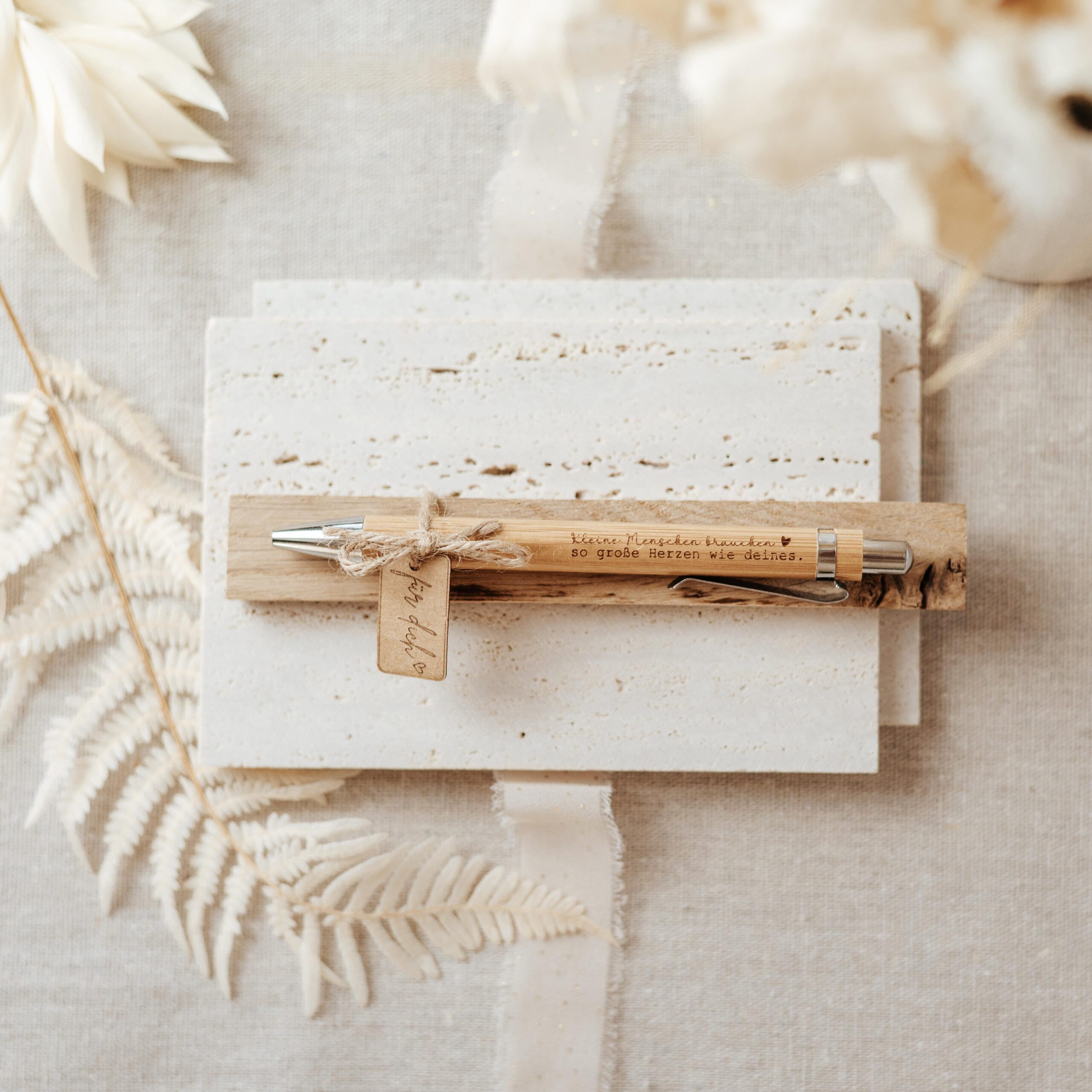 Jeder Stift wird liebevoll auf einem Holzklötzchen befestigt und mit einem Papierkärtchen mit der Gravur „für dich“ verziert – sofort als Geschenk bereit. Ideal als kleine Aufmerksamkeit, motivierendes Präsent oder Dankeschön für Freunde, Familie, Kollegen oder Lehrer. Ein schöner Alltagsbegleiter, der nicht nur schreibt, sondern auch Freude schenkt.