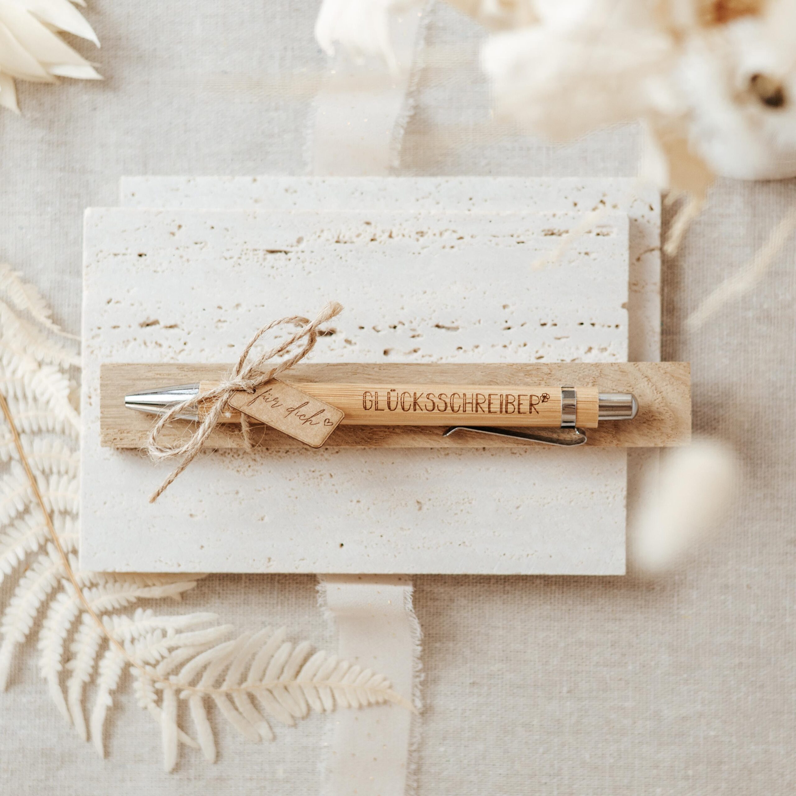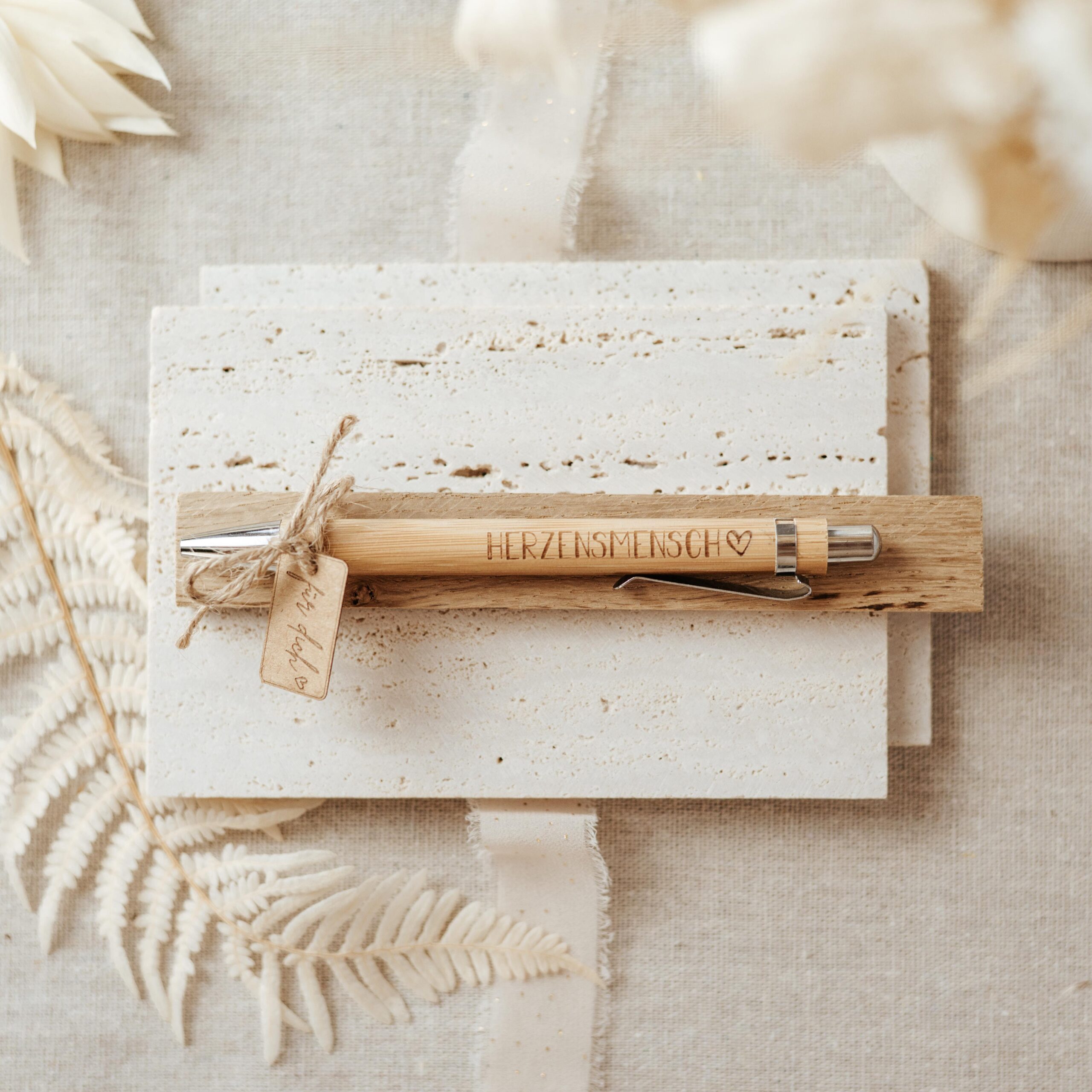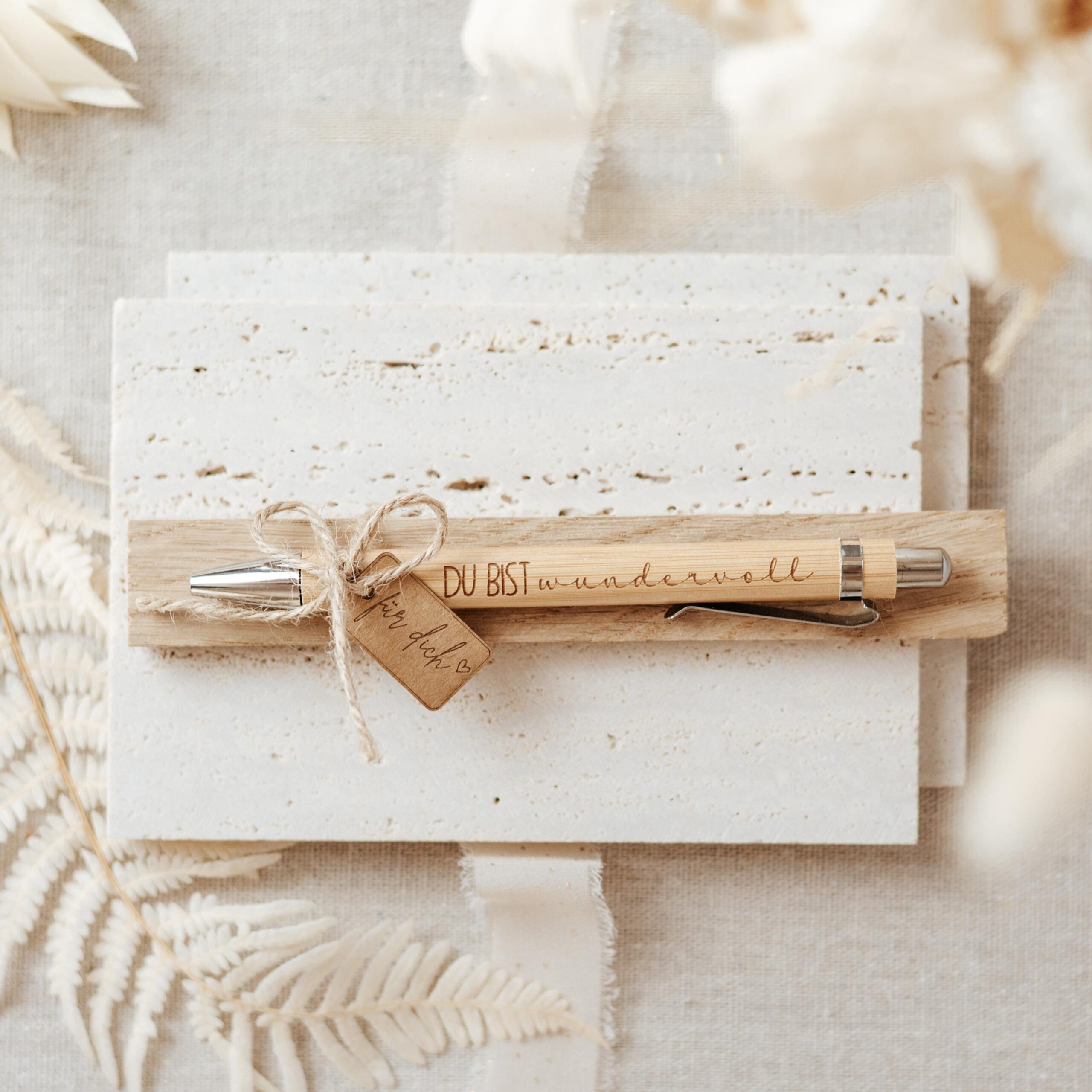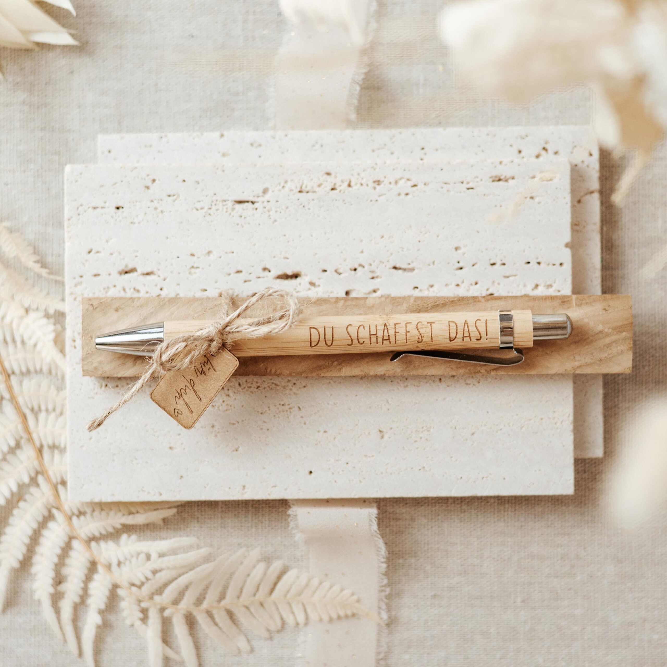 Jeder Stift wird liebevoll auf einem Holzklötzchen befestigt und mit einem Papierkärtchen mit der Gravur „für dich“ verziert – sofort als Geschenk bereit. Ideal als kleine Aufmerksamkeit, motivierendes Präsent oder Dankeschön für Freunde, Familie, Kollegen oder Lehrer. Ein schöner Alltagsbegleiter, der nicht nur schreibt, sondern auch Freude schenkt.