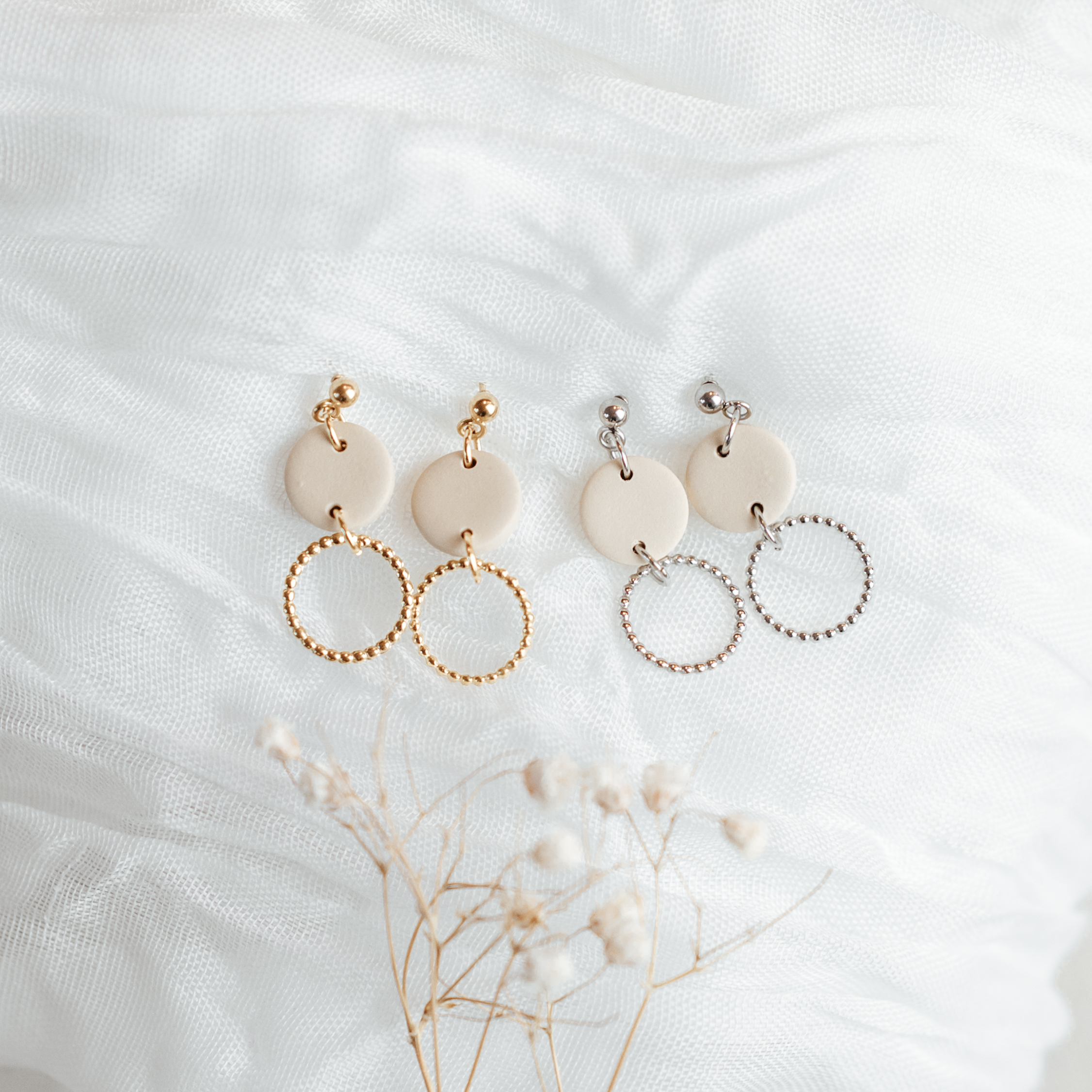 Die Ohrhänger Bubble Circles sind ein stilvolles Schmuckstück mit moderner Note. Sie bestehen aus einer runden Basis aus handgefertigtem Polymer Clay und einem zarten, detailreich gearbeiteten Kreis-Anhänger im „Bubble“-Design.