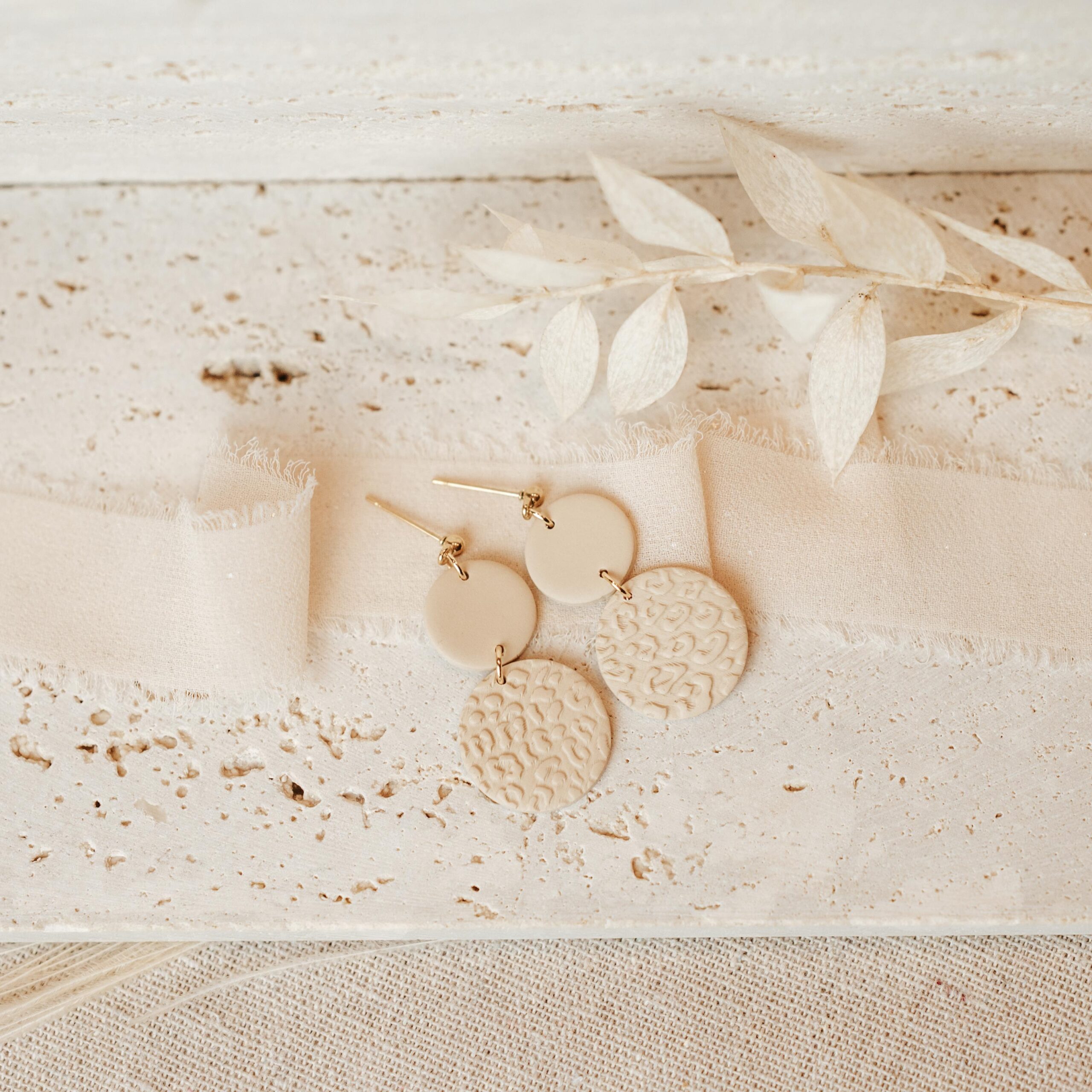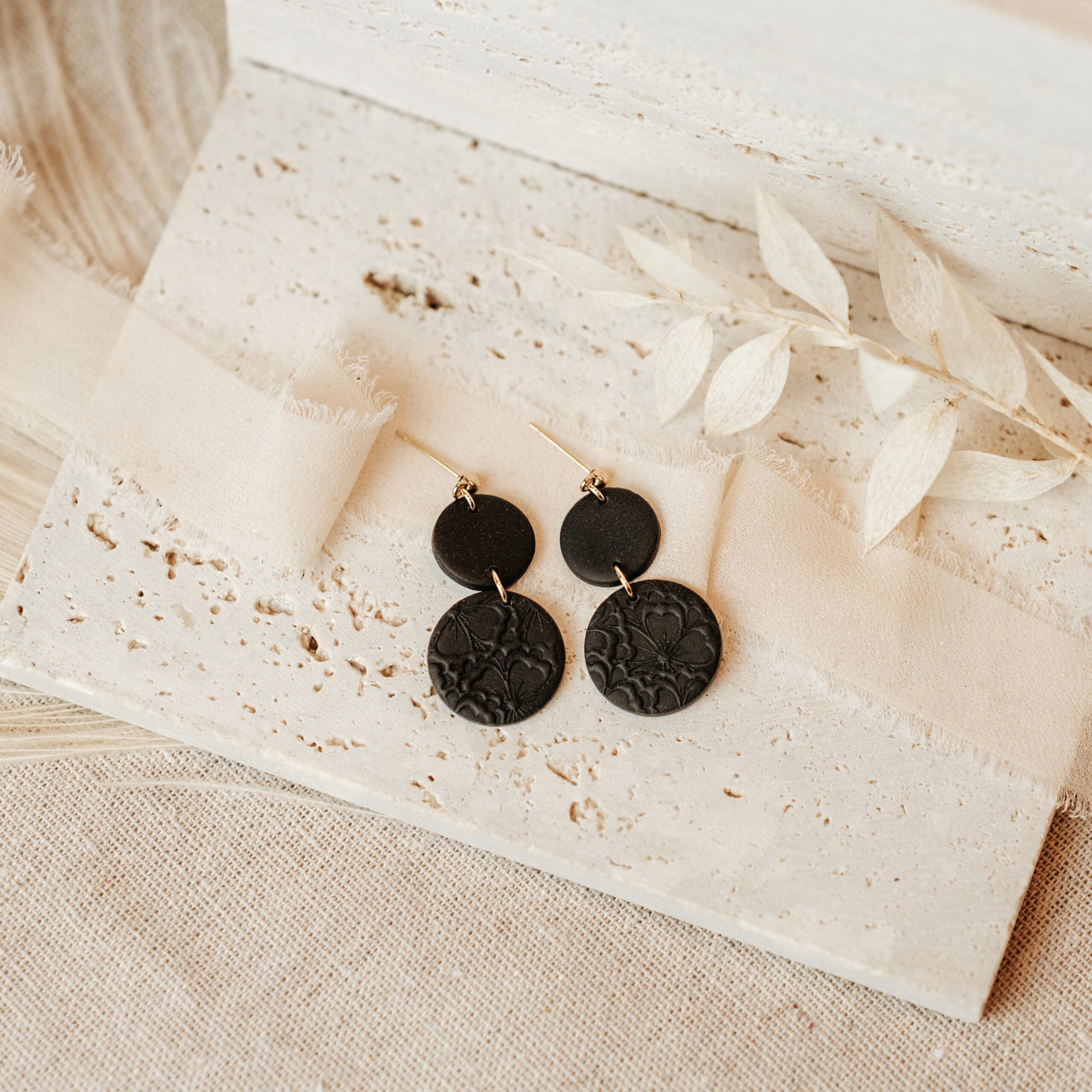 Ohrhänger Double Circles vereinen modernes Design mit einem Hauch von Struktur. Sie bestehen aus zwei handgefertigten Kreisen aus Polymer Clay, wobei der größere Kreis mit einer feinen Prägung bzw. Aufdruck versehen ist.